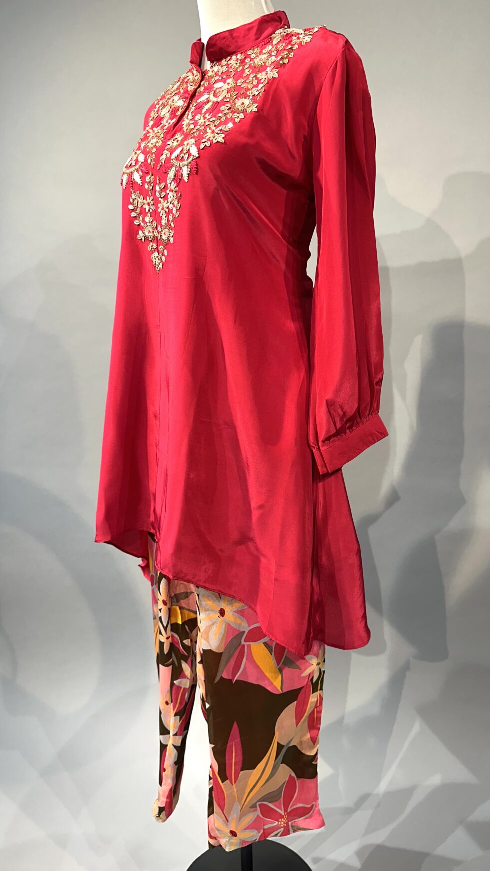 A vibrant red crepe co-ord set featuring elegant golden detailing on the neckline, paired with stylish printed pants. Bold, chic, and perfect for festive or evening wear.
