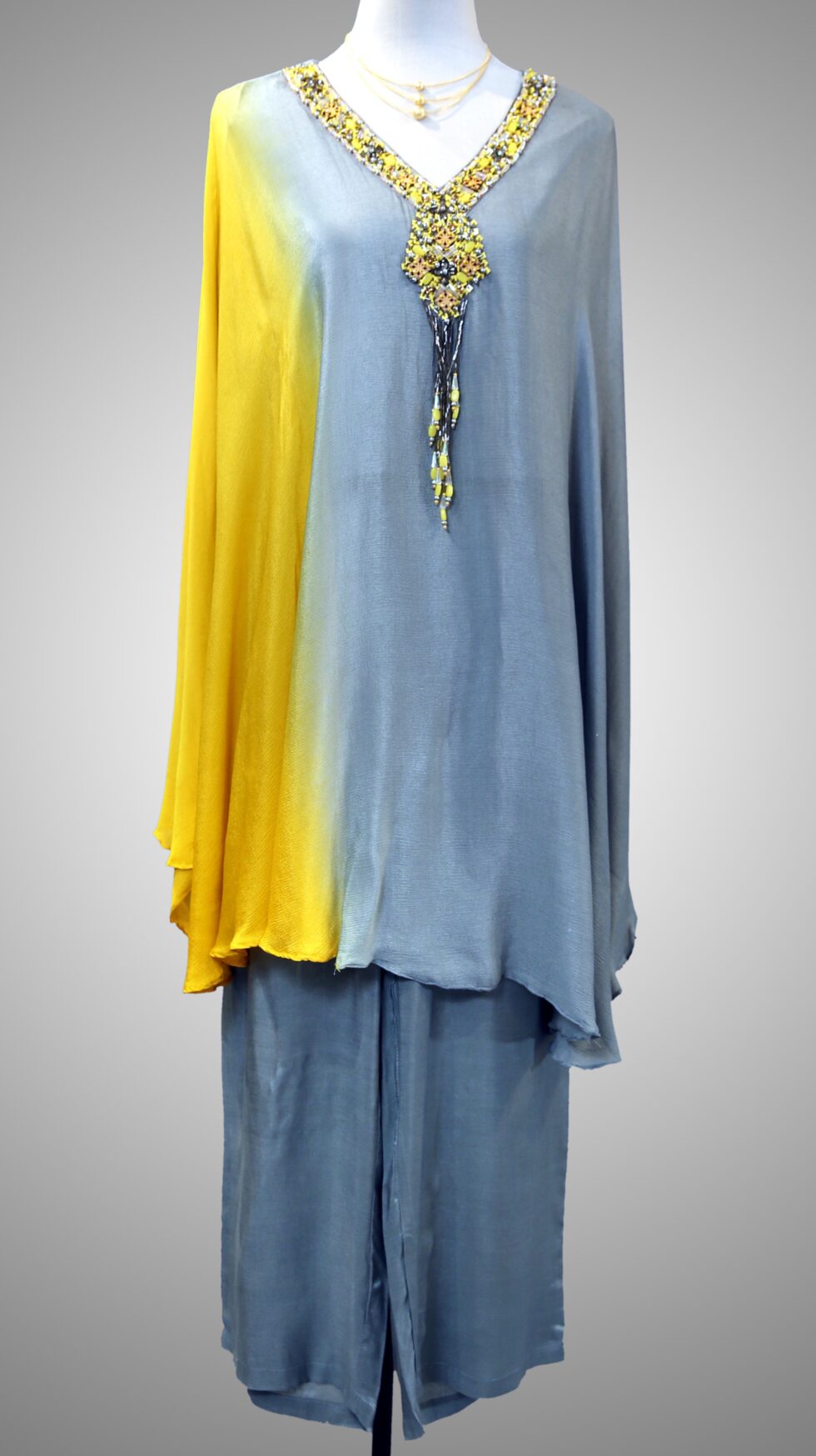 Grey and yellow ombré cape set featuring a flowy embellished-neck tunic paired with solid gray straight-fit pants — a perfect blend of elegance and contemporary style.