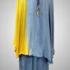 Elegant pink, blue, and beige crepe coord set featuring a C-cut tunic with golden embellishments, paired with solid beige pants — a graceful fusion of colour and contemporary design.