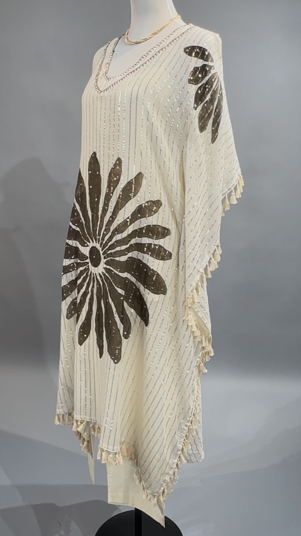 Elevate your everyday elegance with this 3-piece ivory mul cotton kaftan set. The outer kaftan features a striking oversized brown floral motif, adding an earthy charm and statement appeal to the breezy silhouette. Paired with a soft, sleeveless ivory inner and coordinated ivory cotton pants, this ensemble blends comfort with contemporary artistry. Lightweight and breathable, it’s perfect for warm days and effortless style.