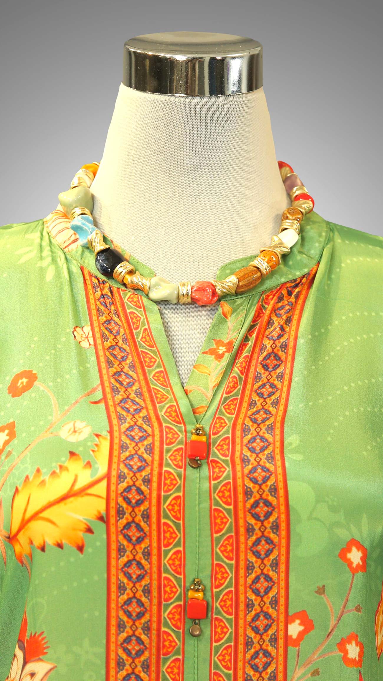 Crepe green coord set featuring a floral print tunic paired with matching straight-fit pants, blending comfort with effortless elegance.