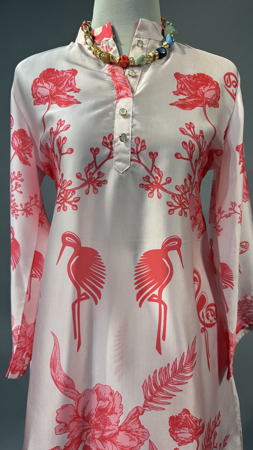 A playful yet elegant powder pink co-ord set crafted from soft glace cotton, designed for comfort and style. The tunic features a charming pink flamingo motif that adds a whimsical touch, echoed subtly on the matching pants. Breezy and feminine, this set is perfect for casual brunches, resort wear, or daytime outings with a stylish twist.