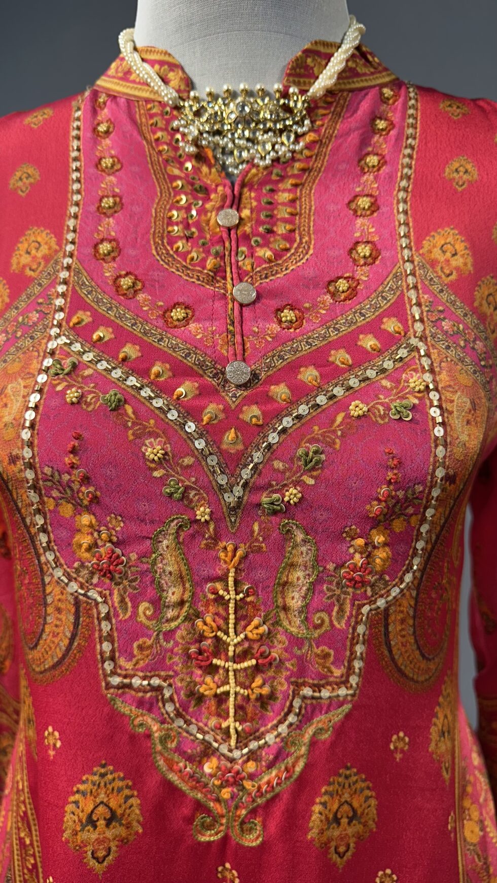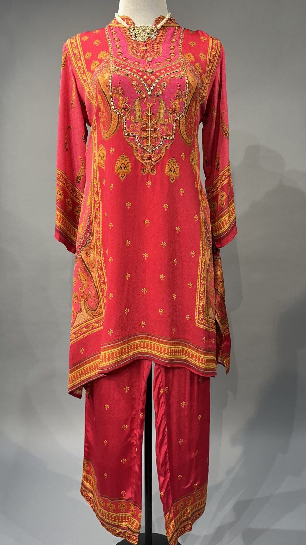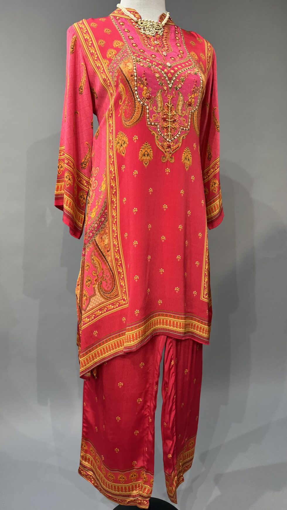 A premium pink crepe co-ord set featuring vibrant digital prints on both the tunic and matching pants, blending comfort with contemporary elegance.
