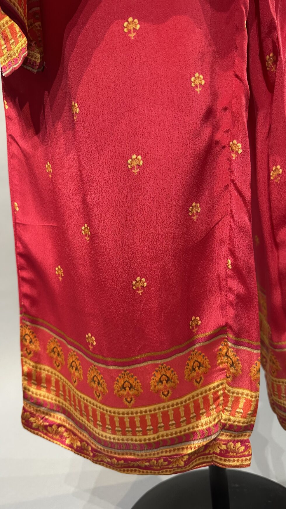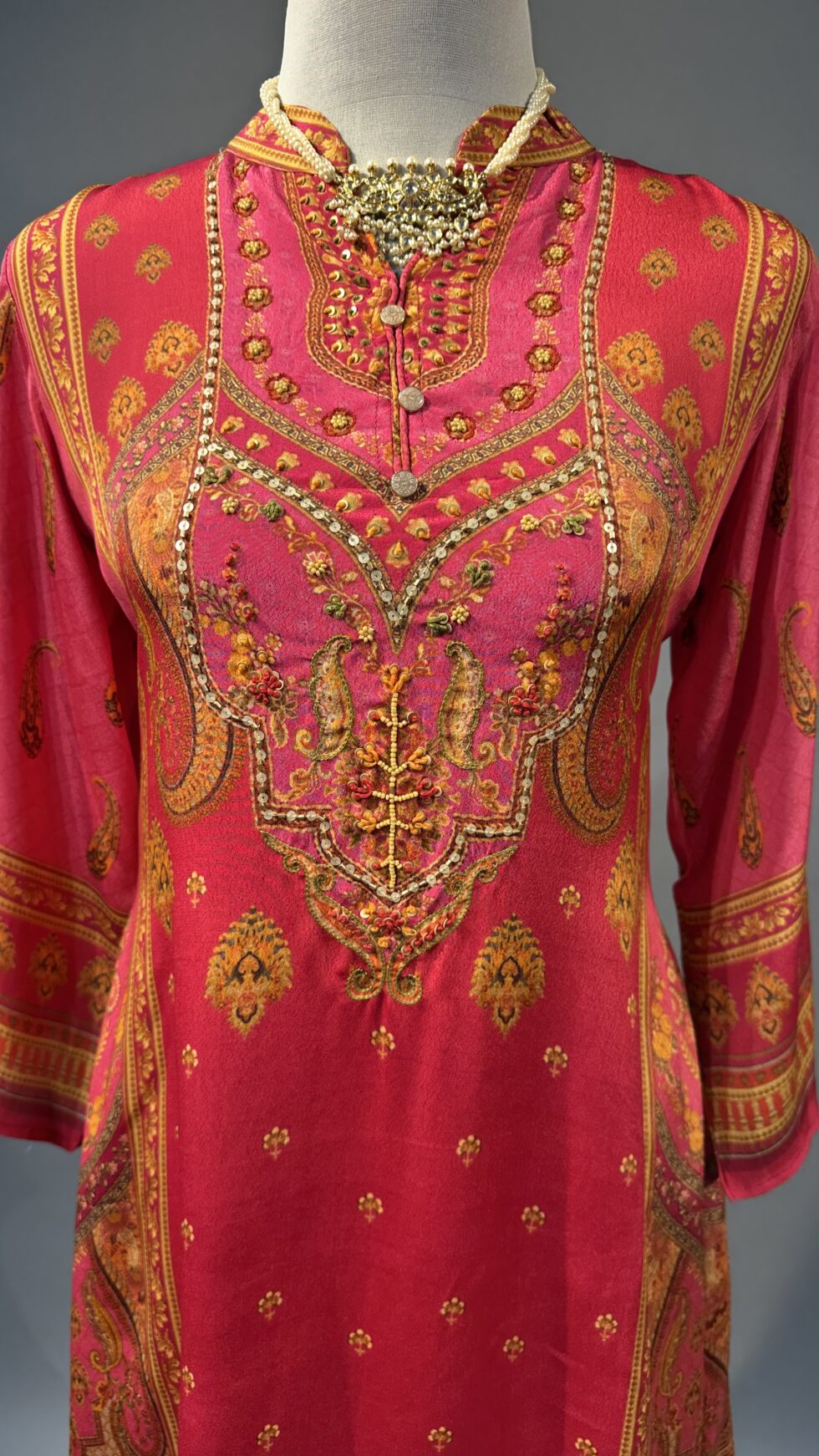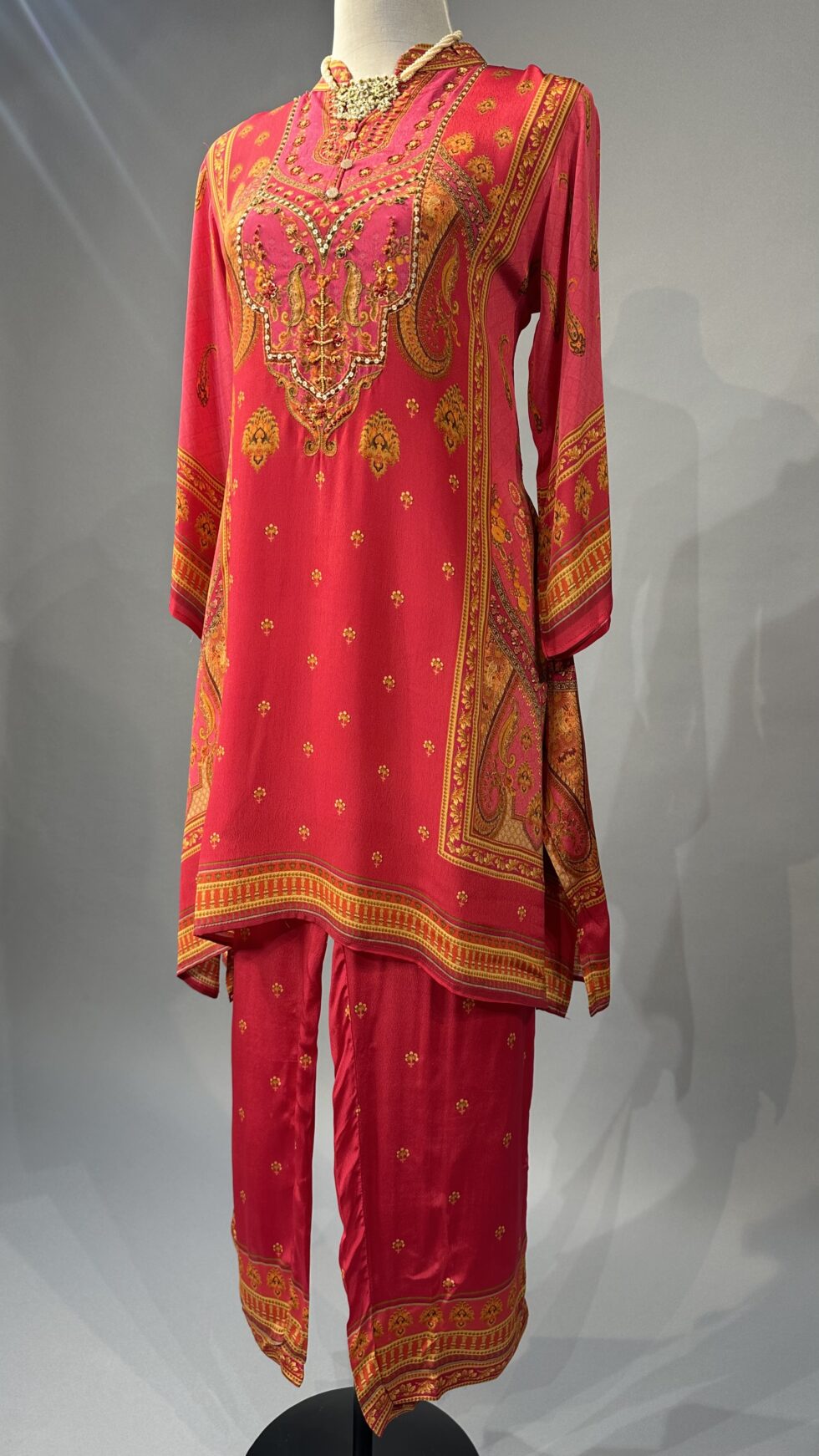 A premium pink crepe co-ord set featuring vibrant digital prints on both the tunic and matching pants, blending comfort with contemporary elegance.