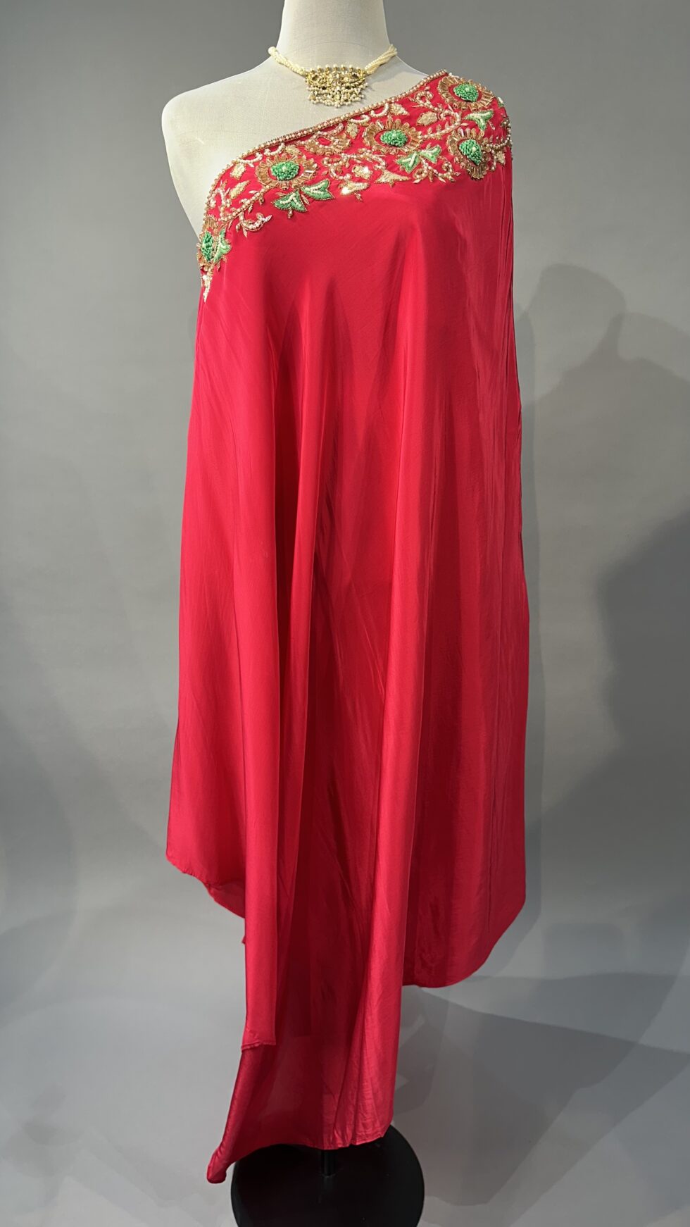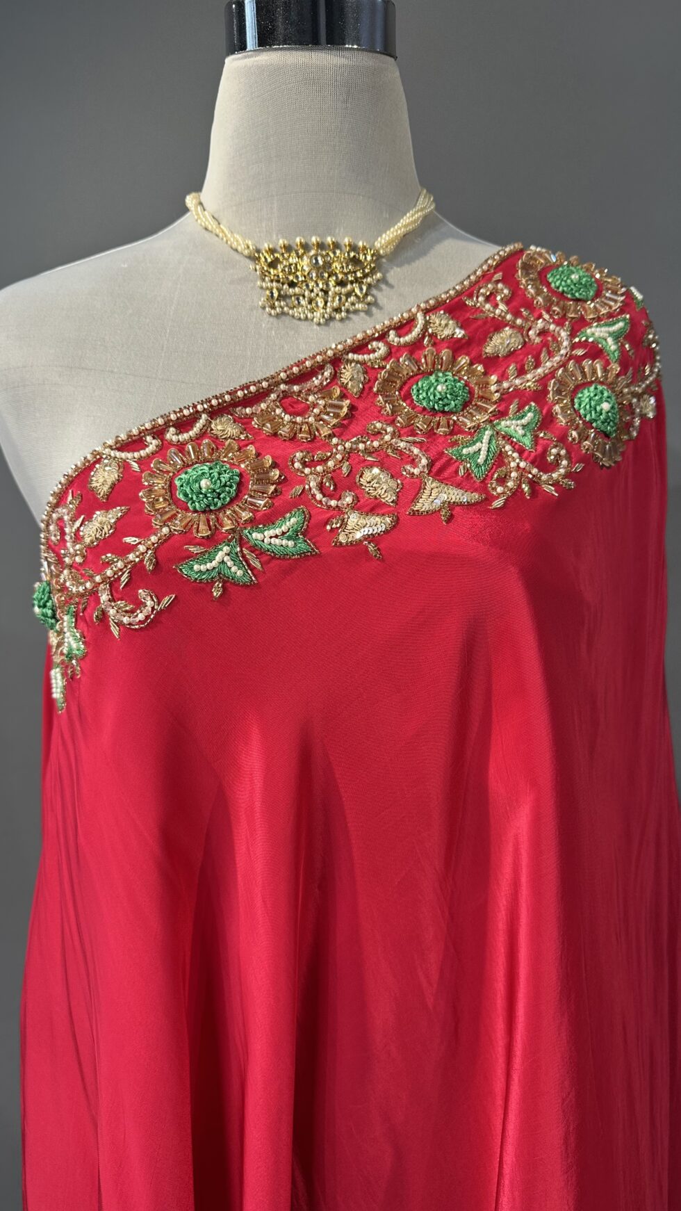 A bold and elegant designer co-ord set in vibrant fuchsia pink, crafted from premium crepe fabric for a flattering drape and smooth finish. The off-shoulder top exudes contemporary charm, beautifully enhanced with intricate golden embellishments along the neckline, adding a touch of shimmer and sophistication. Paired with coordinated straight-fit pants in matching fuchsia, this ensemble strikes the perfect balance between modern glamor and festive flair—ideal for cocktail evenings, celebrations, or destination events.