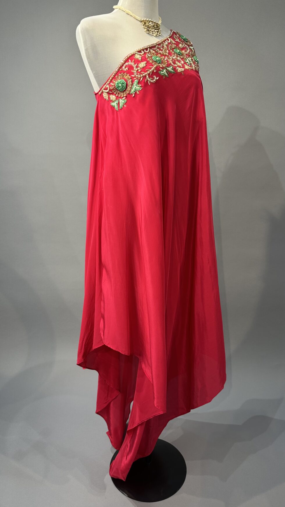 A chic fuchsia pink crepe co-ord set featuring an off-shoulder top with elegant golden embellishments on the neckline, paired with matching pants. Perfect for festive evenings or stylish celebrations.