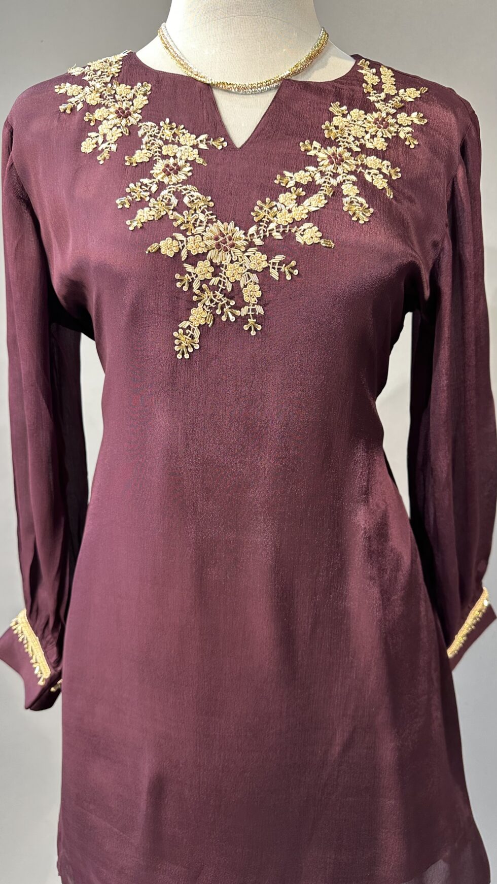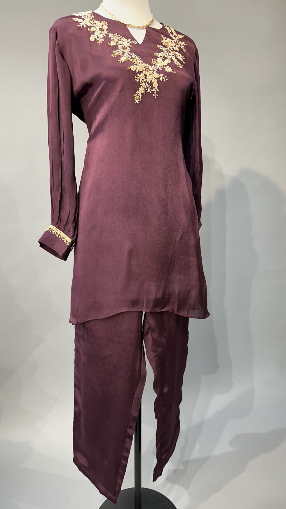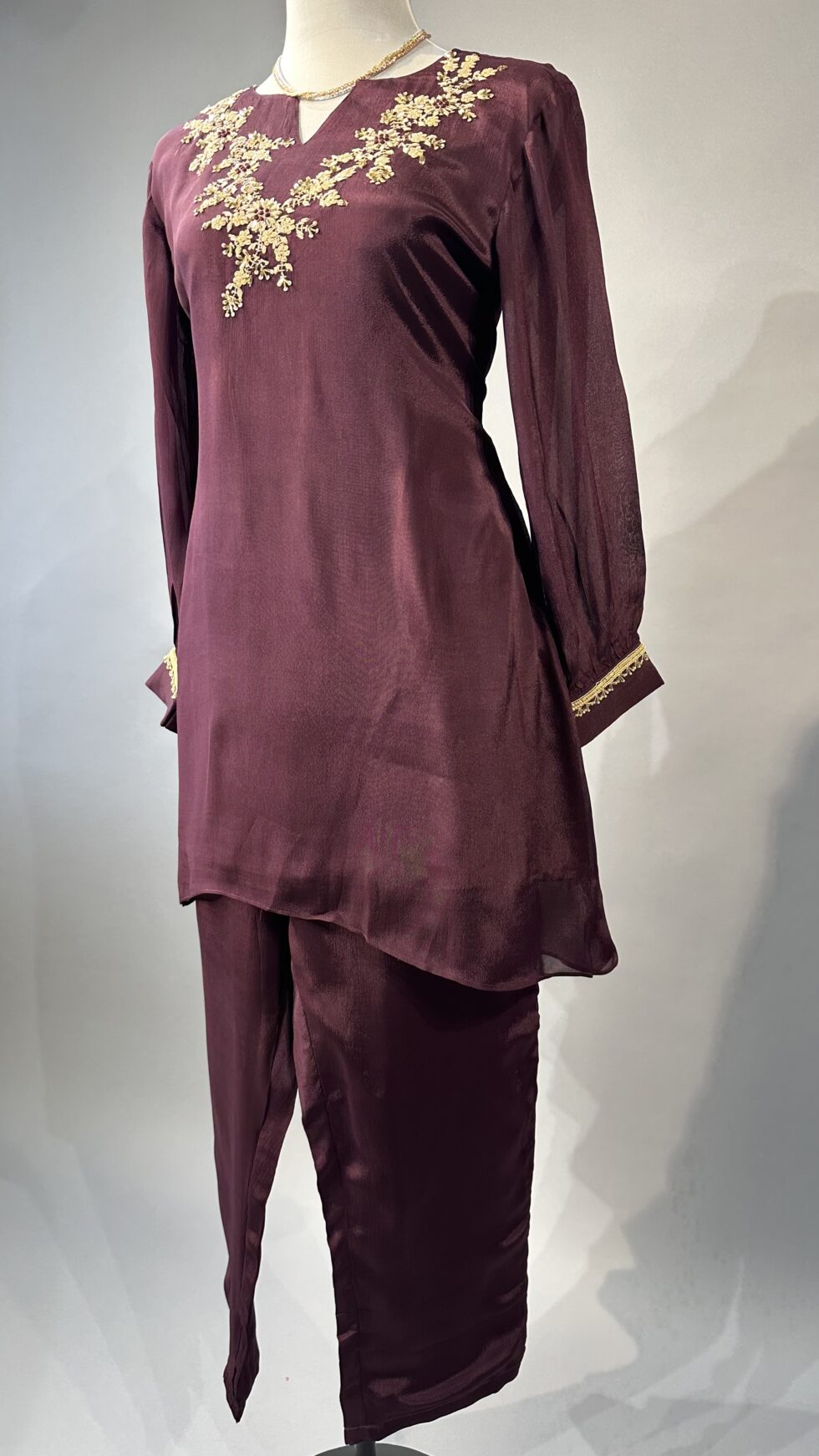 A chic wine-colored co-ord set designed for elegance and sophistication, featuring a stylish top adorned with delicate golden embellishments along the neckline. Paired with matching tailored pants, this ensemble blends rich color with subtle shimmer, perfect for festive occasions or evening outings.