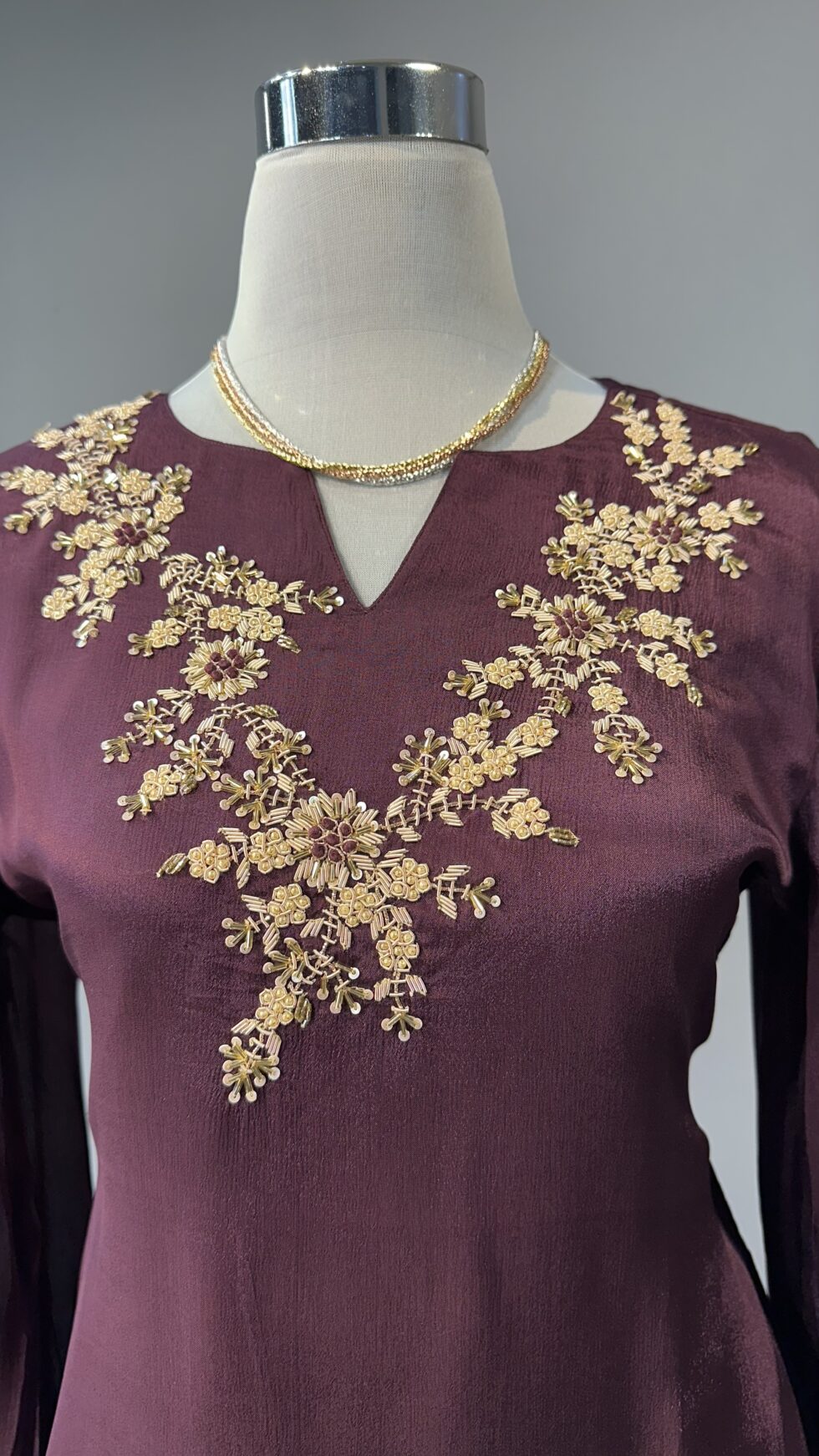 • Color: Rich wine with delicate sequin embellishment