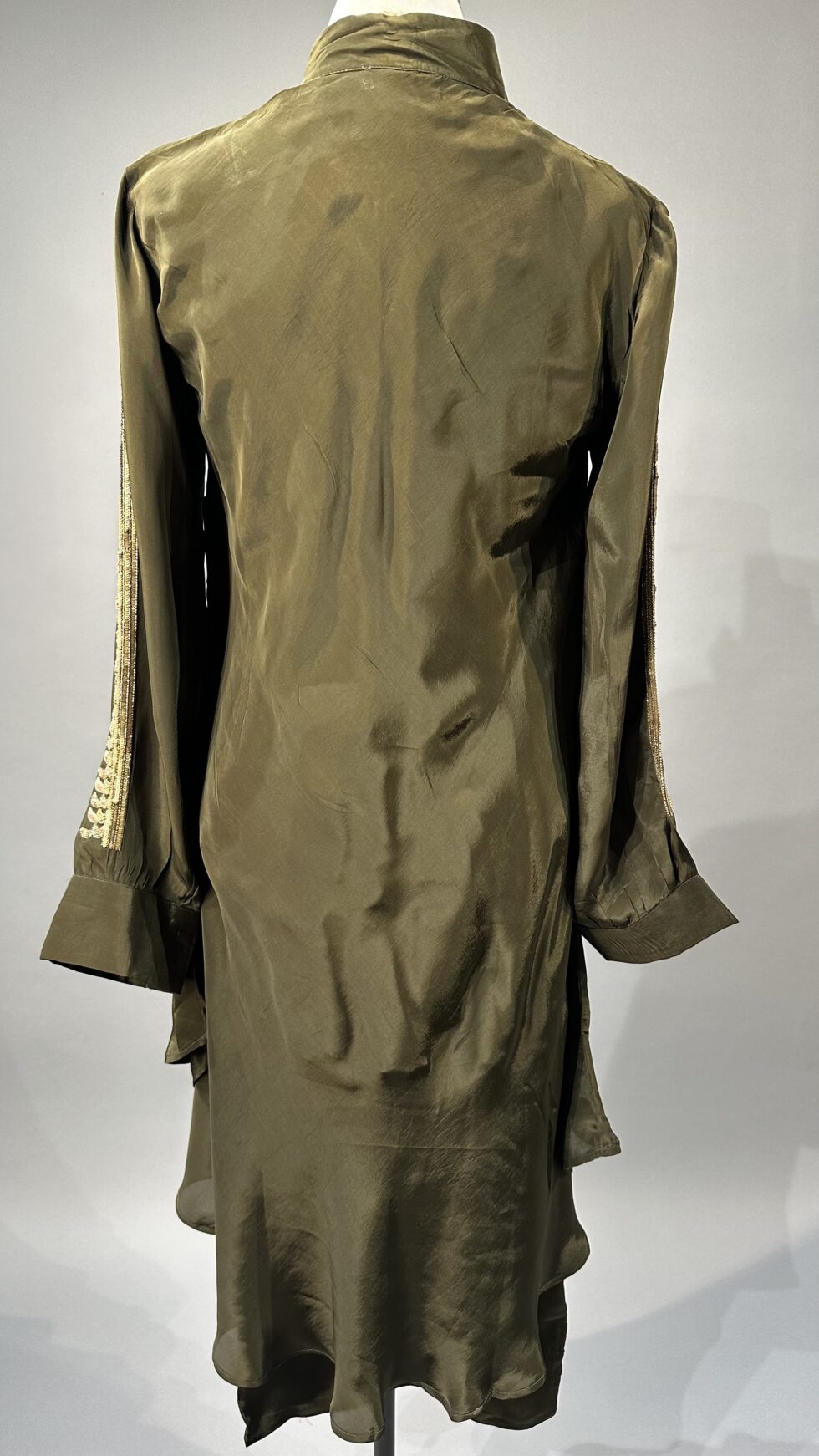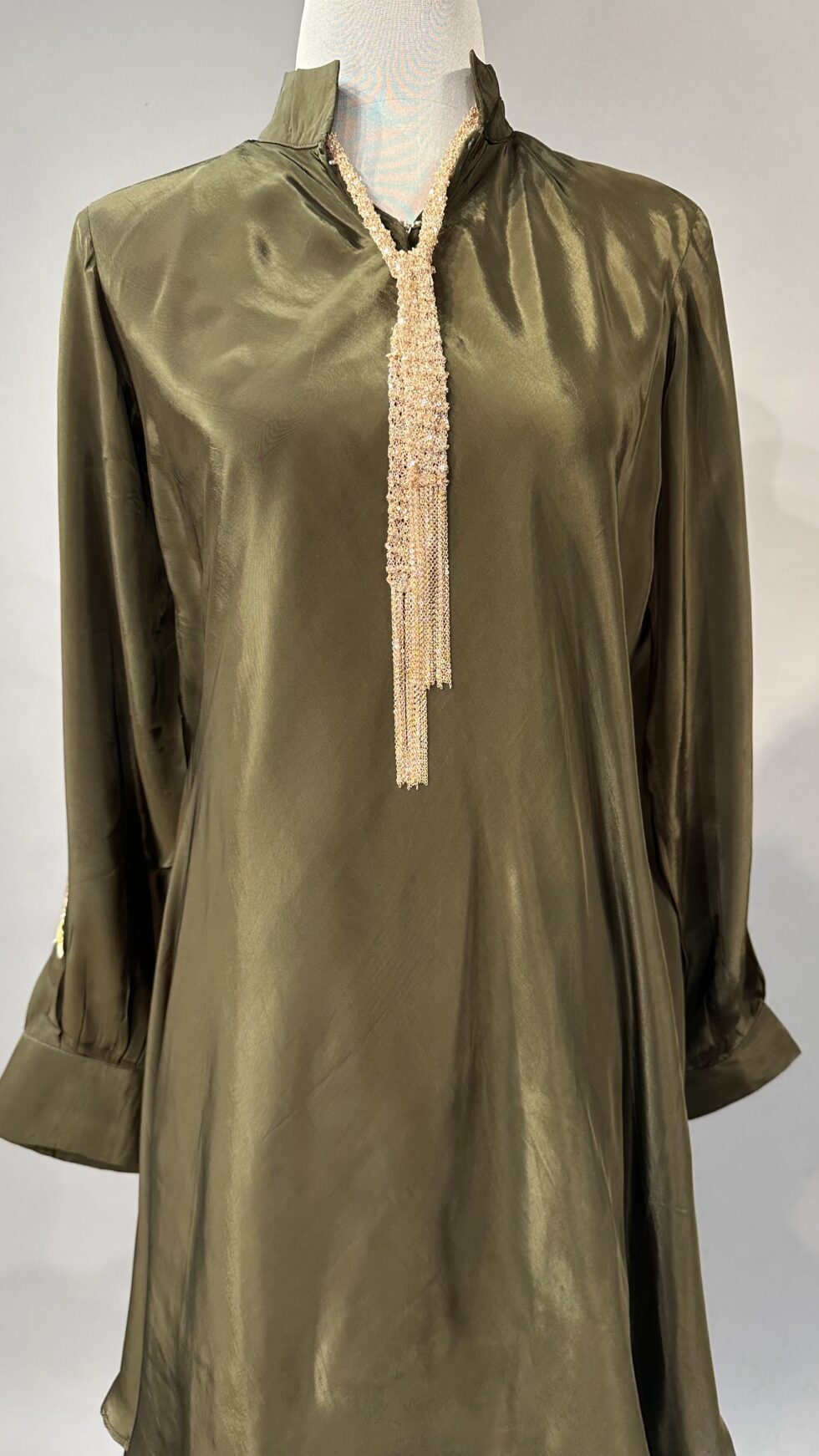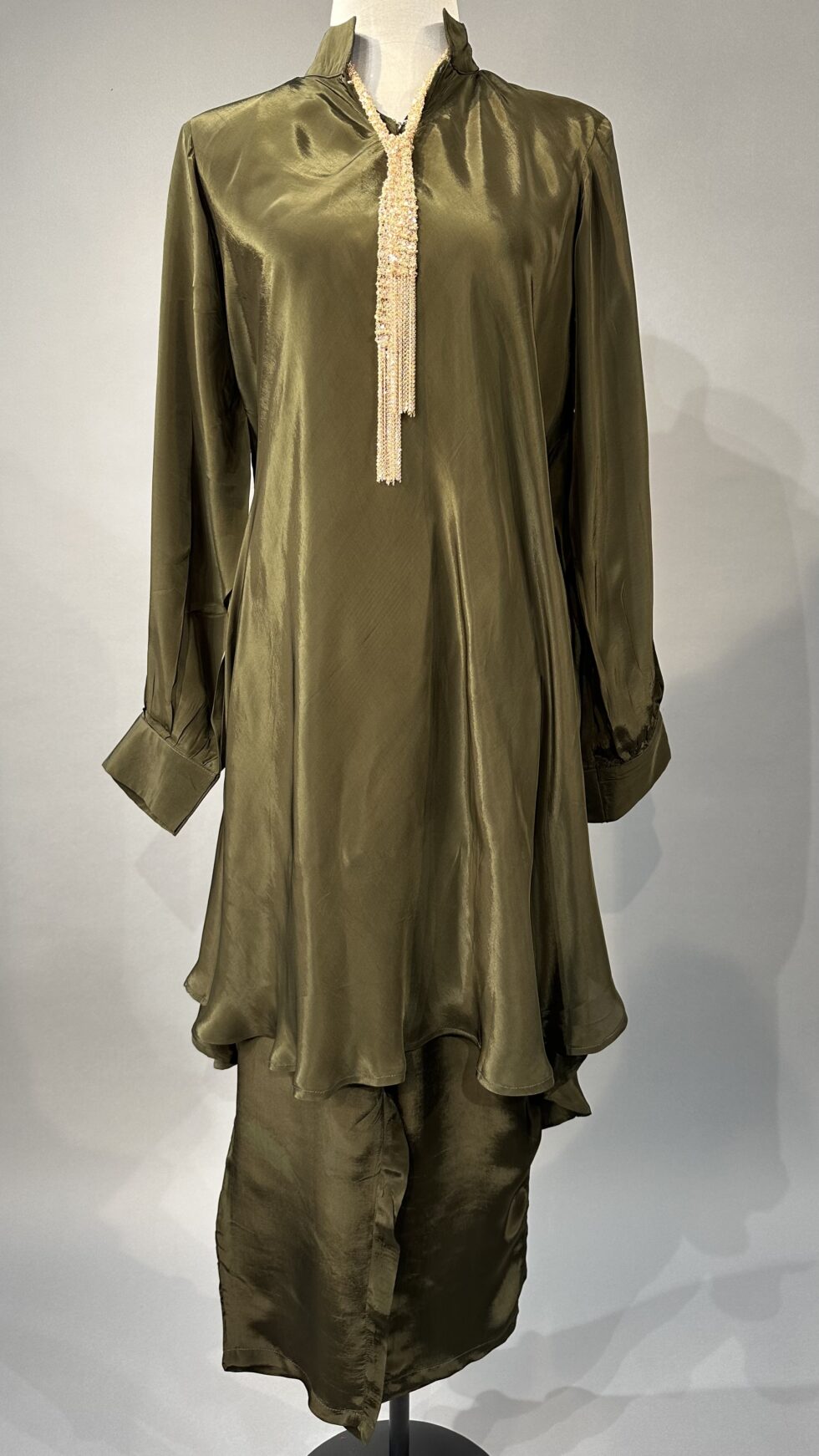 Elevate your wardrobe with the understated elegance of the Olive designer co-ord set, crafted in soft, flowy crepe and designed for modern sophistication. The rich olive green hue is complemented by delicate golden sequin embellishments on the sleeves, adding just the right amount of shimmer and festive charm.