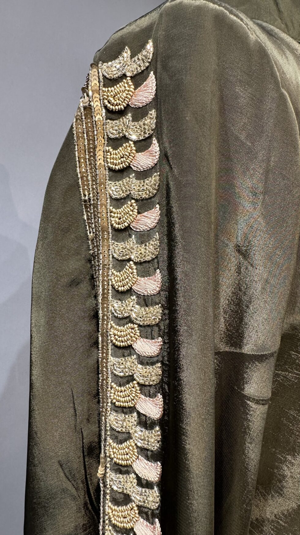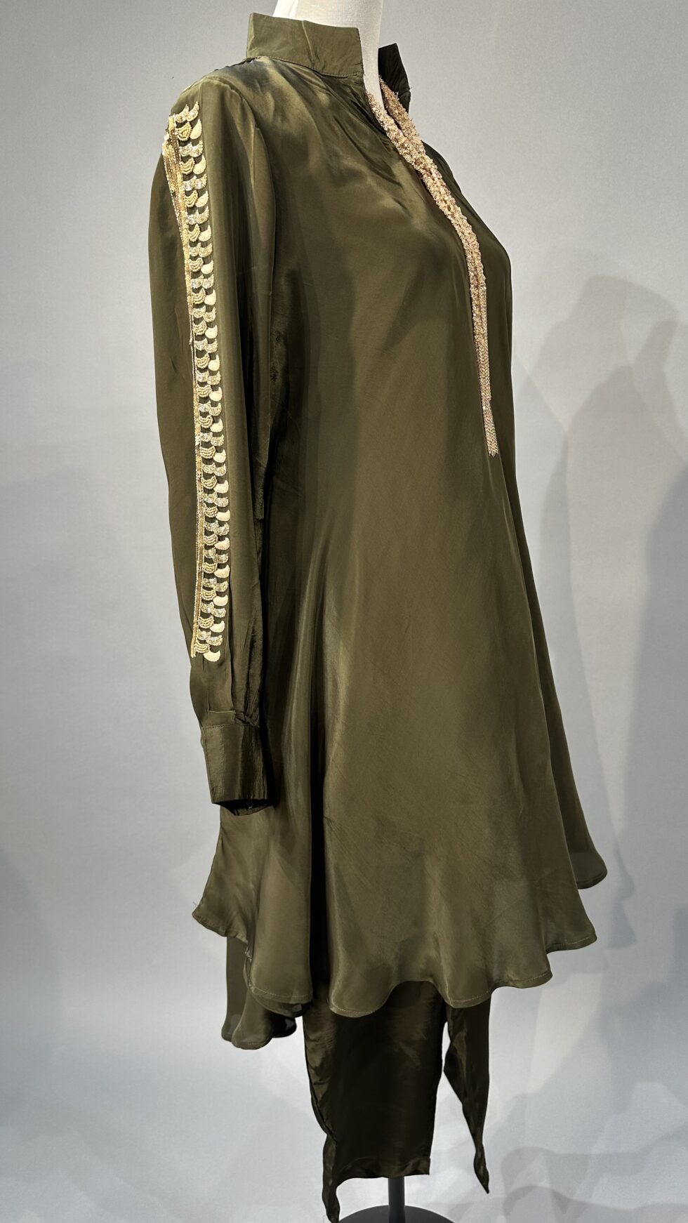 Stay effortlessly elegant in this olive green crepe designer co-ord set, featuring golden sequin detailing on the sleeves and matching pants—perfect for festive gatherings or chic day events.