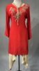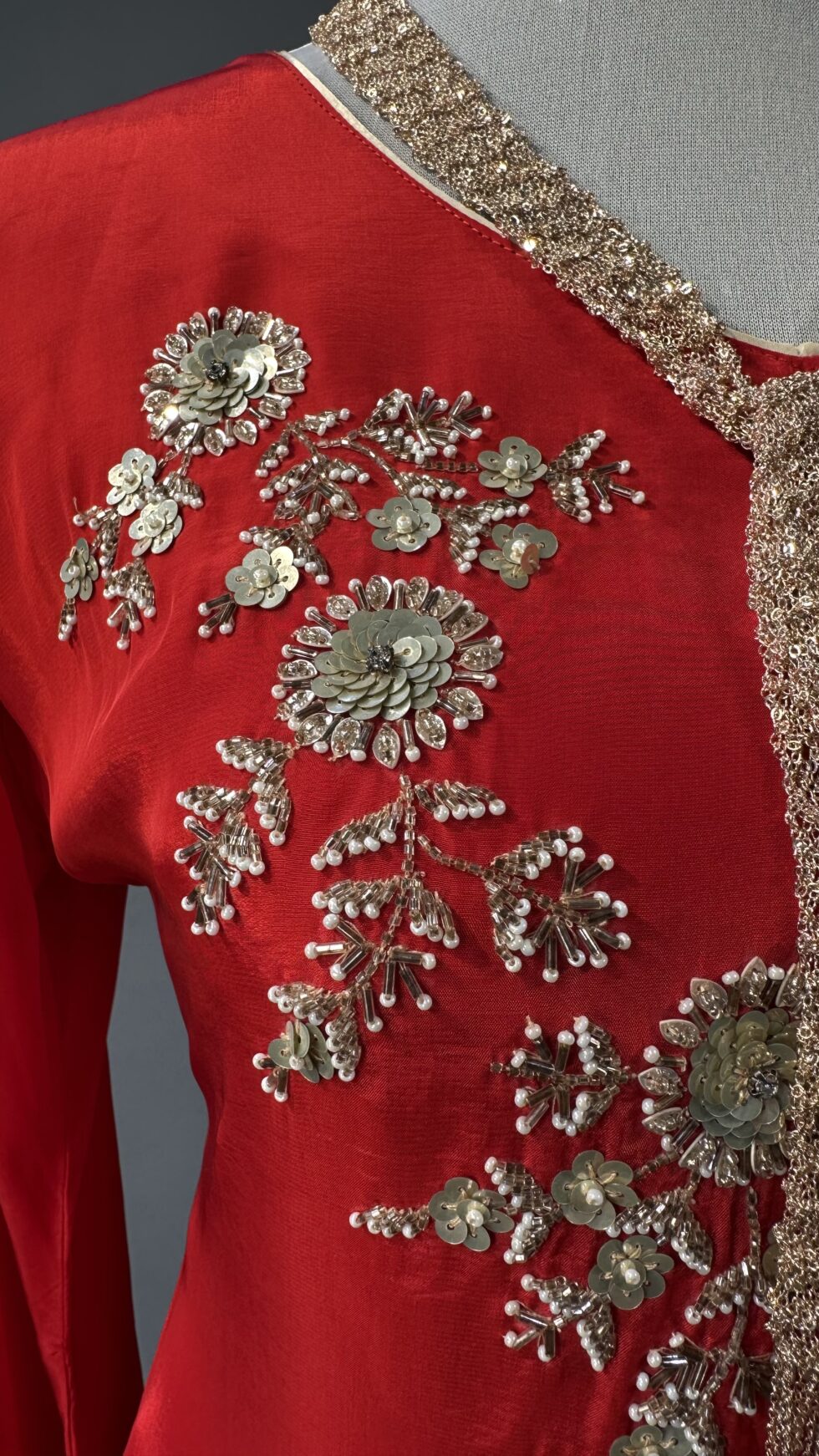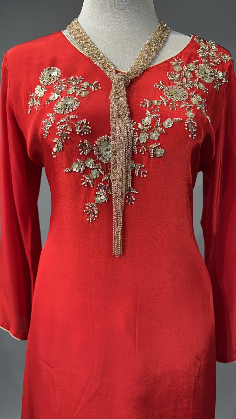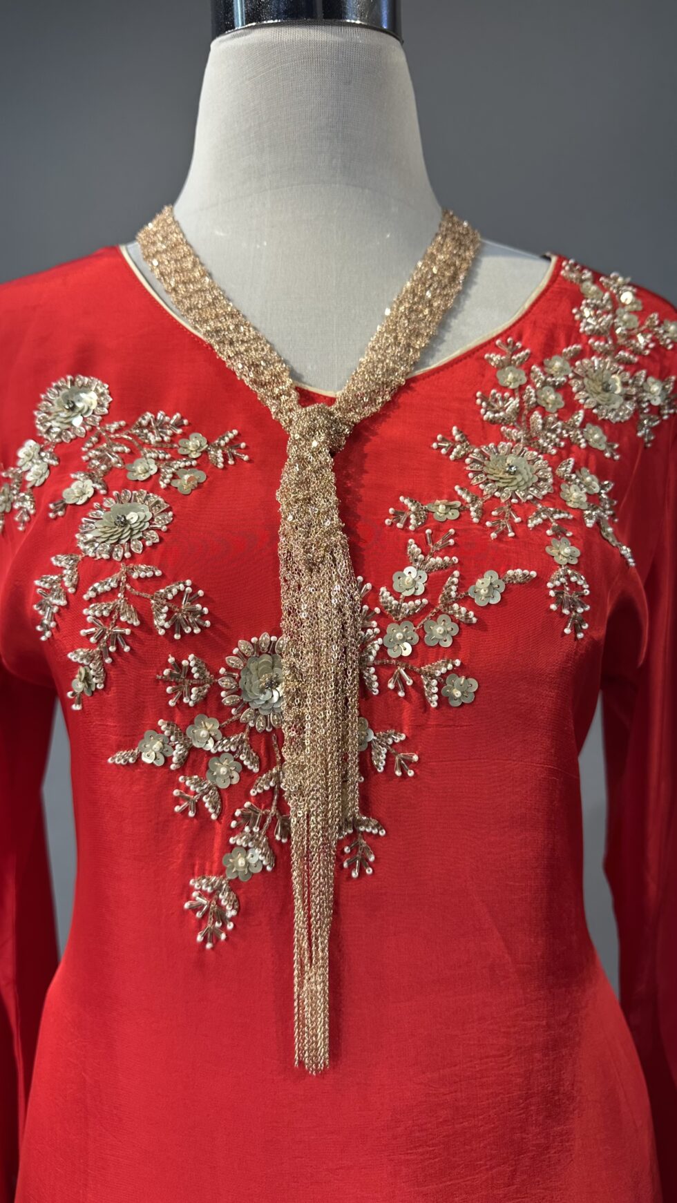 Make a statement in this red crepe designer co-ord set, featuring golden sequin detailing on the neckline paired with stylish beige tulip pants. A perfect blend of festive flair and modern elegance.