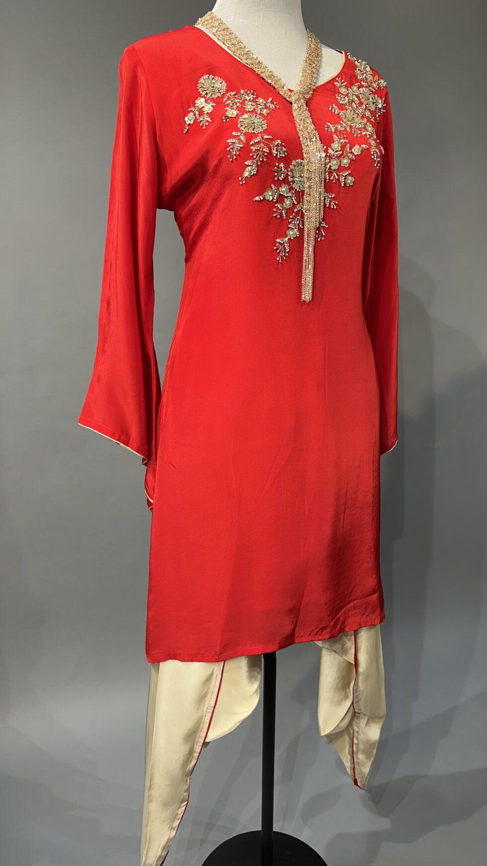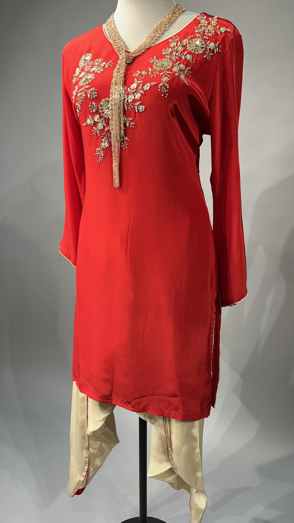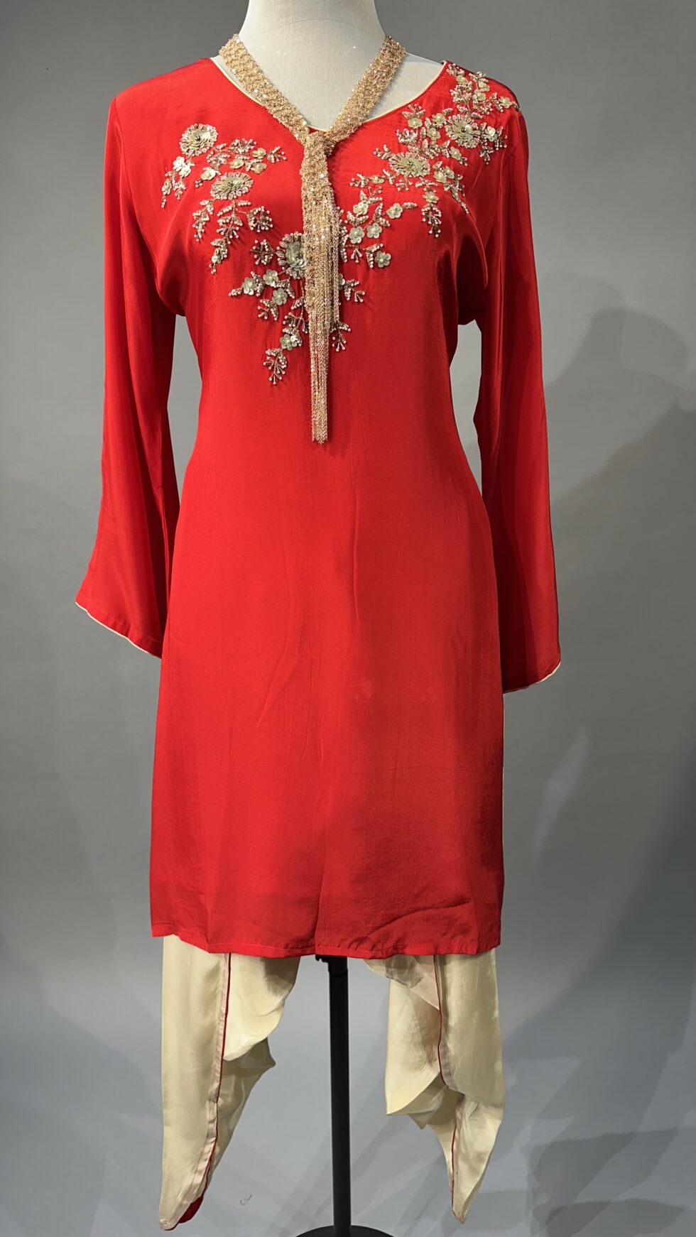 - Color: Deep red top with golden sequin detail, beige tulip pants