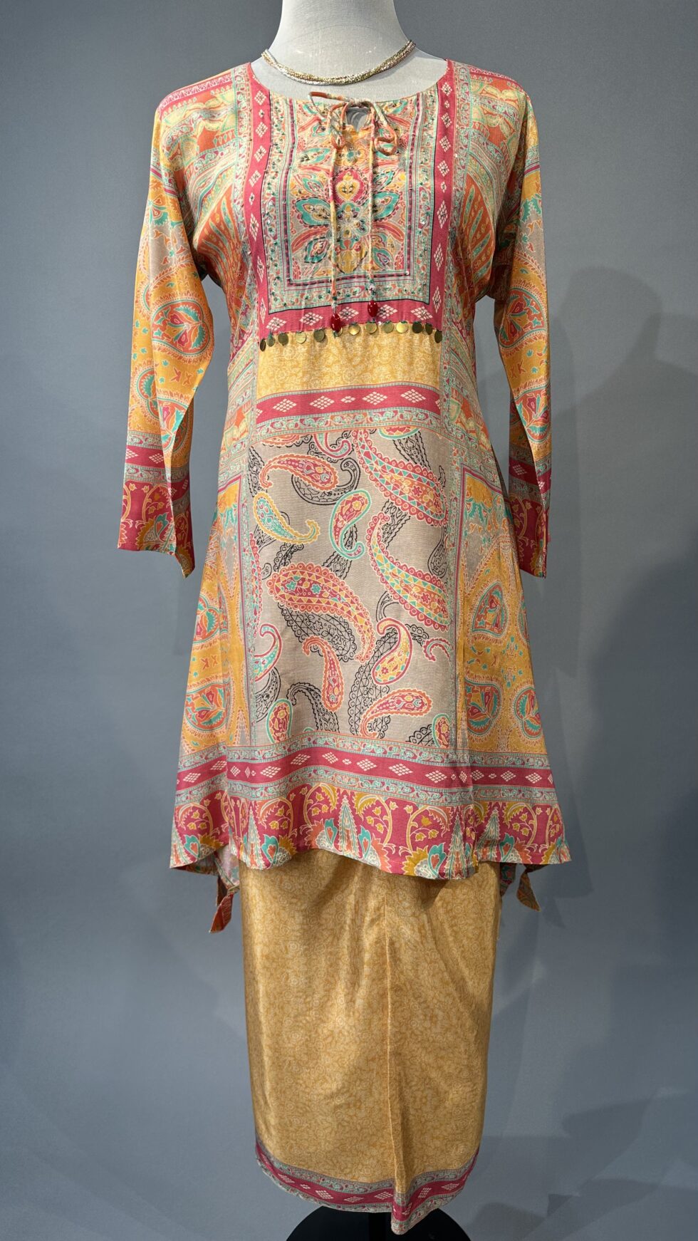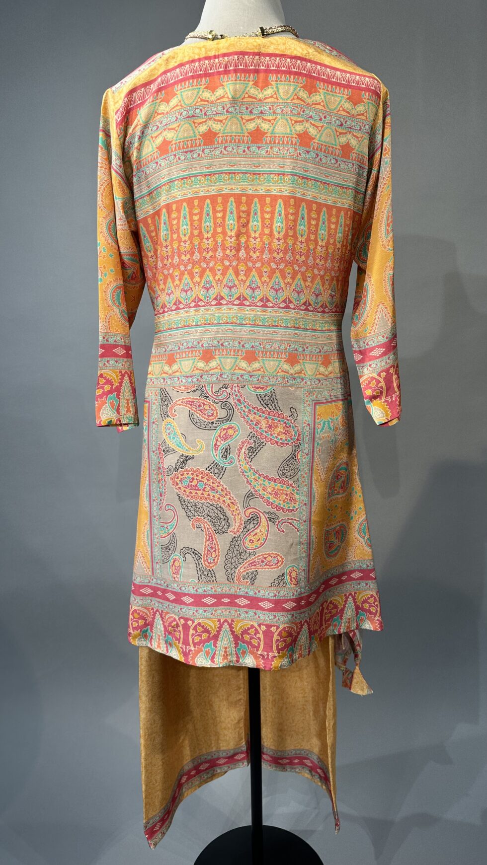 Turn heads in this saffron designer crepe co-ord set, featuring a digitally printed asymmetrical tunic paired with flared matching pants. Crafted in lightweight crepe, the set offers a vibrant, contemporary look that’s perfect for brunches, festive gatherings, or chic day events.