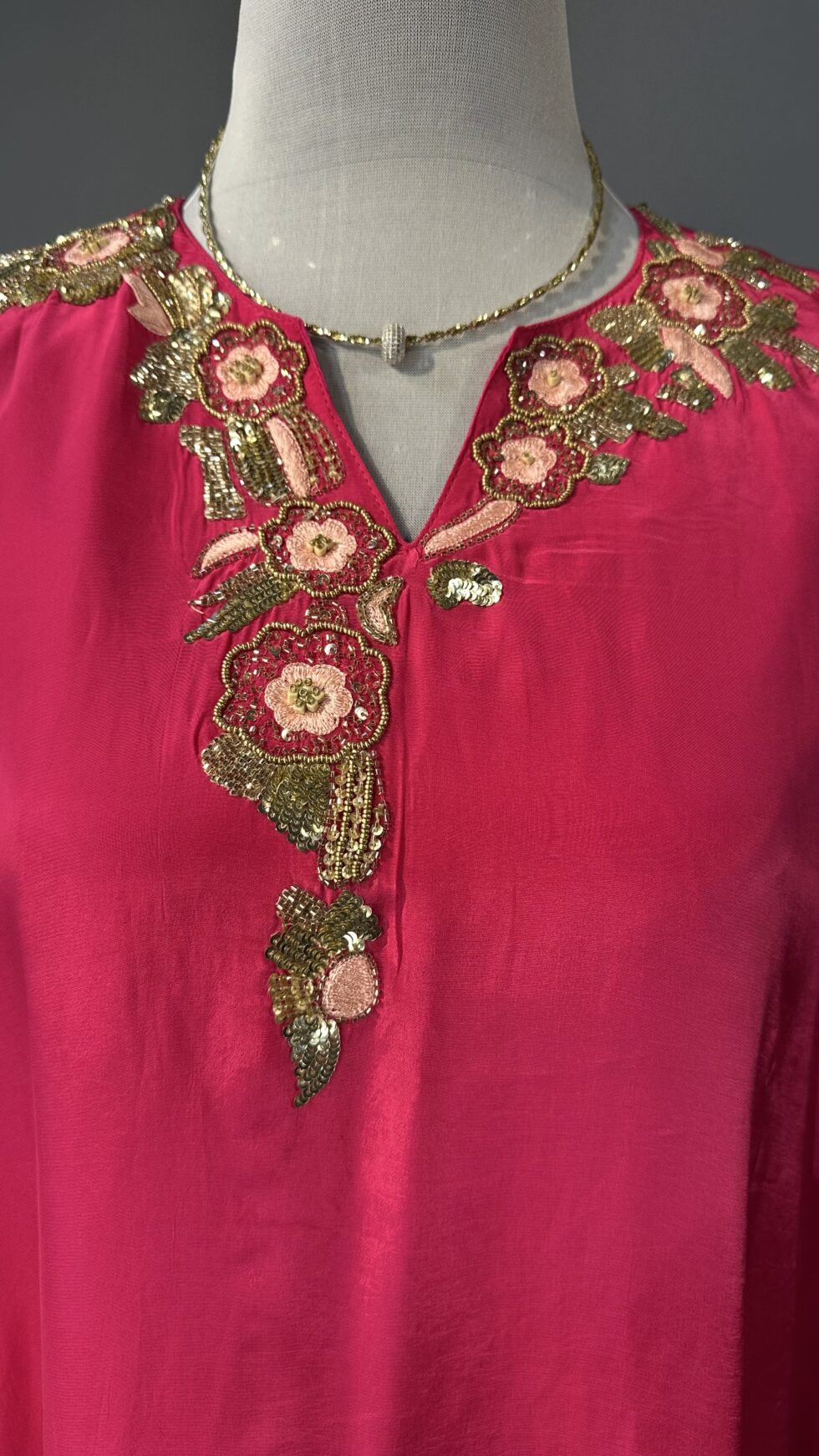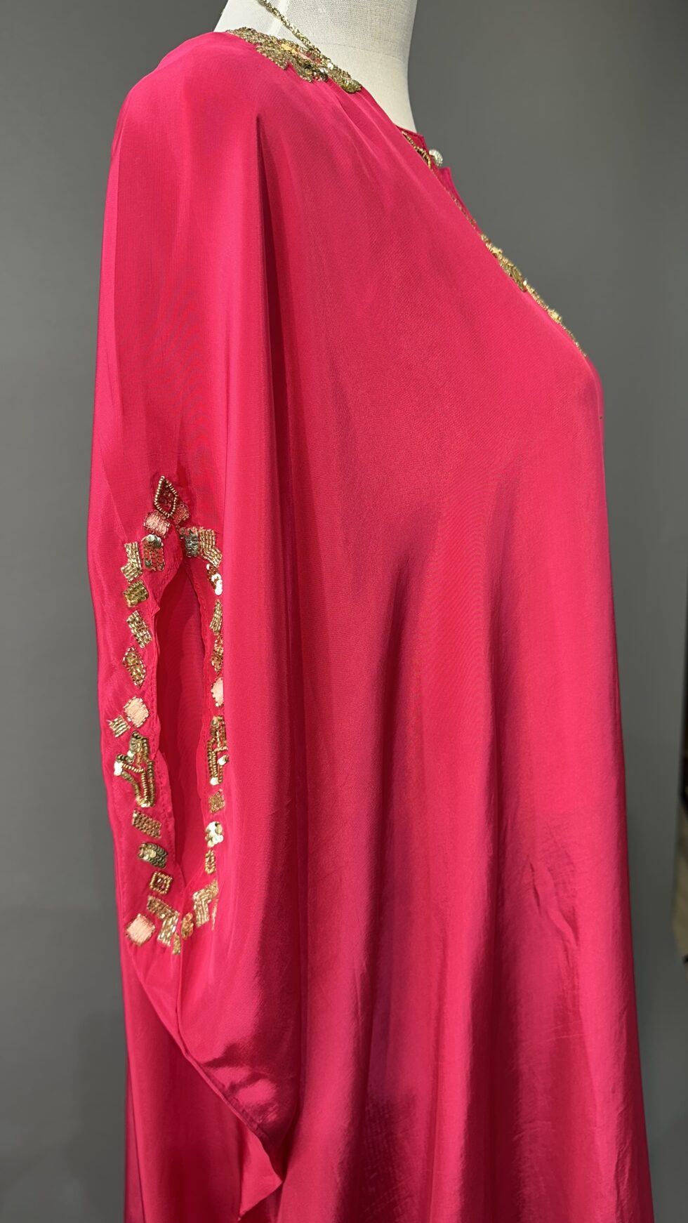 A striking fuchsia pink crepe kaftan set featuring golden sequin embellishments on the neckline and armholes. Paired with matching pants, this elegant ensemble blends comfort with festive charm.
